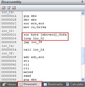 ShellCode가 시작되는 90위치에 마우스커서를 옮겨놓은 후, 코드를 보면 XOR 값으로 의심되는 0xfa가 있다.