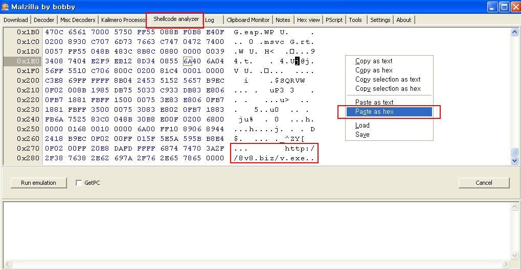 ShellCode analyzer 탭으로 이동하여 마우스 우측버튼의 Paste as hex 로 붙여놓으면 원하는 url을 구할 수 있다.