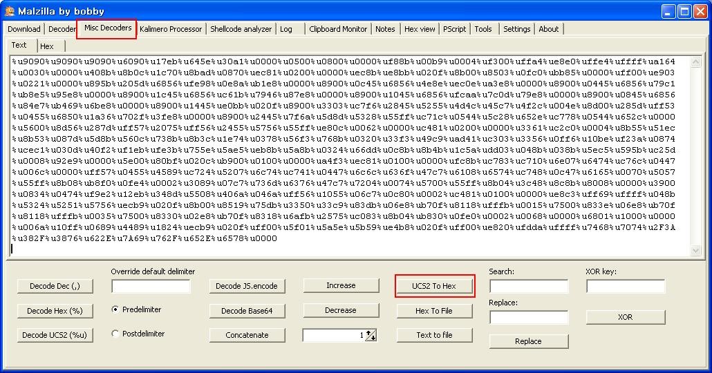 ShellCode 부분을 모두 복사하여 부분적 수정 후 Malzilla Misc Decoders탭으로 이동하여 UCS2 to Hex로 변환