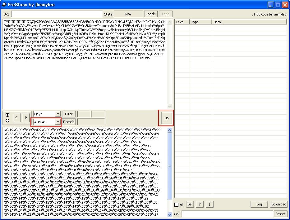 Decode 종류를 ALPAH2로 선택하여 디코딩 한다. 이후 UP을 클릭하여 디코딩 대상창으로 이동시킨다.